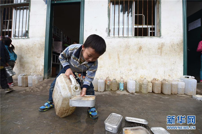 在廣西大化瑤族自治縣板升鄉(xiāng)八好小學(xué),一名學(xué)生喝水桶里的雨水(2014年11月24日攝)。八好小學(xué)有400多名學(xué)生,曾僅有一個(gè)不足100立方米的水柜,用于收集儲(chǔ)存樓頂?shù)挠晁?,學(xué)生需定期定量用水。遇到長(zhǎng)時(shí)間不下雨,學(xué)校需要到鄉(xiāng)政府所在地運(yùn)水。如今,學(xué)校修建了5個(gè)大水柜,并從兩公里外引泉水到校園,飲水難問(wèn)題得到解決。 新華社記者 黃孝邦 攝
