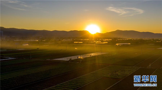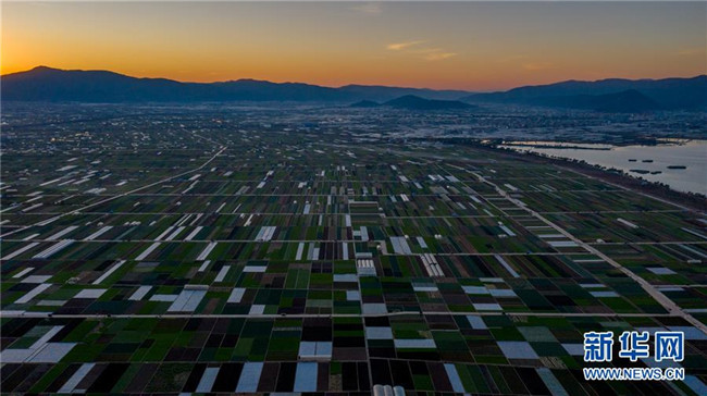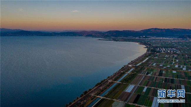 這是云南省玉溪市通??h的田園風(fēng)光(11月23日無人機(jī)拍攝)。初冬時節(jié),云南省玉溪市通海縣風(fēng)景秀麗,山巒、湖水與農(nóng)田組成了一幅美麗的田園詩畫卷。新華社記者胡超攝