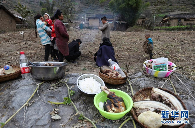 11月24日,在昭覺(jué)縣支爾莫鄉(xiāng)阿土列爾村,當(dāng)?shù)鼐用駵?zhǔn)備熟食、酒等食物祭祖,并相互贈(zèng)送。