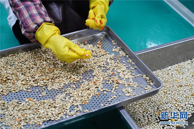 12月3日,在漢濱區(qū)五里工業(yè)集中區(qū)一家南瓜加工企業(yè)車間內(nèi),工人在清理南瓜子。新華社記者 邵瑞 攝
