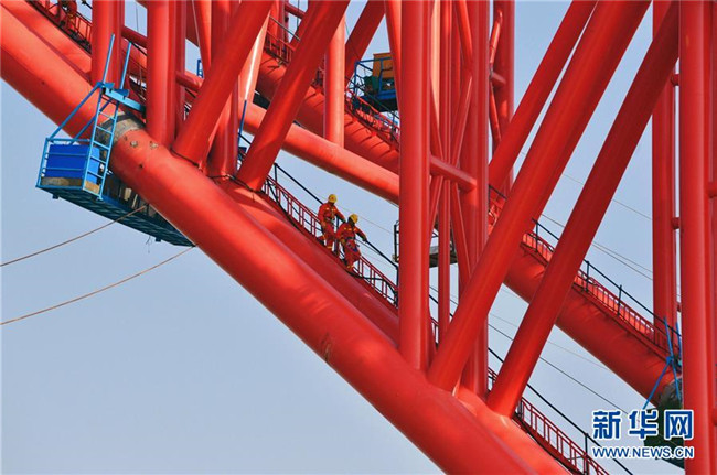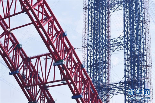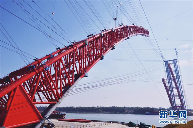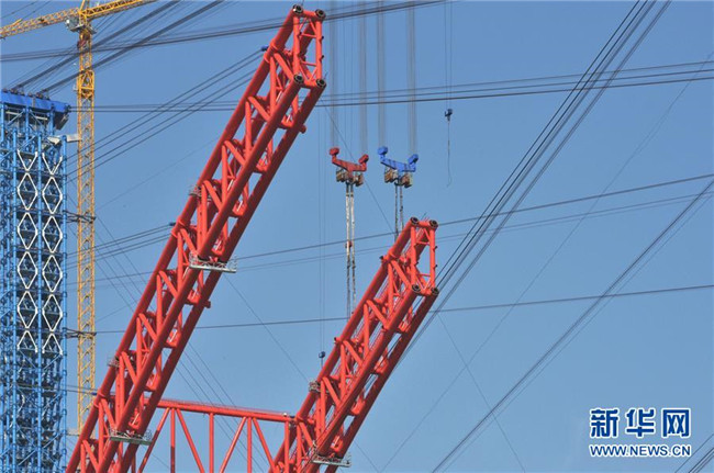 工人在進行大橋主拱拱肋吊裝作業(yè)(12月8日攝)。