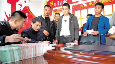 執(zhí)法人員現(xiàn)場為李斌等農(nóng)民工發(fā)放追回的工資。本報記者 馬照剛 攝
