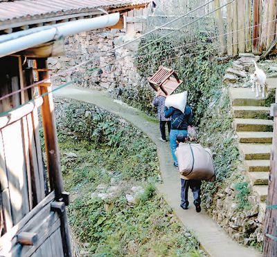 楊昌儒(右)與妻子姜建元(中)、兒子楊海林將行李搬上車,準(zhǔn)備前往縣城安置點(diǎn)。