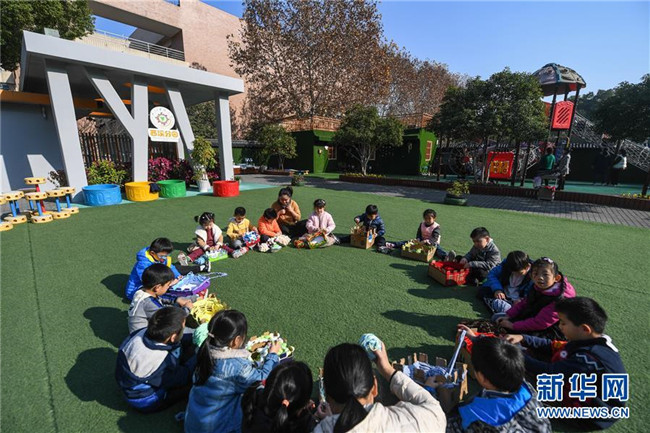 12月11日,小朋友們在老師的帶領(lǐng)下編織愛心圍巾。 新華社記者 徐昱 攝