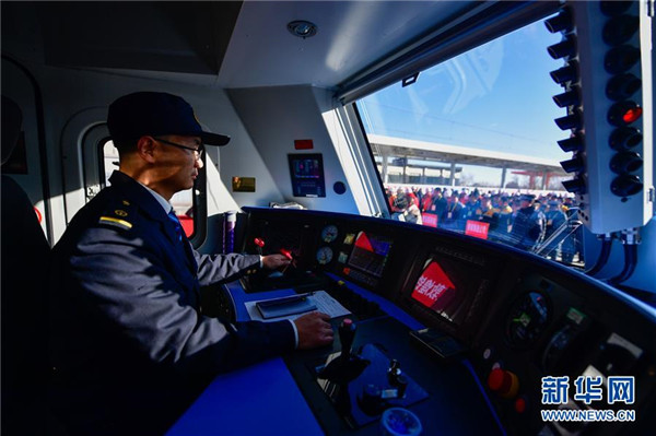 12月18日,在青海格爾木,中國鐵路青藏集團(tuán)有限公司西寧機(jī)務(wù)段列車司機(jī)季仁千扎西在開通儀式上準(zhǔn)備發(fā)車。當(dāng)日,隨著肅北至馬海區(qū)段通車,敦煌鐵路全線開通運(yùn)營,中國西北地區(qū)形成首條環(huán)形鐵路網(wǎng)。新華社記者張龍攝
