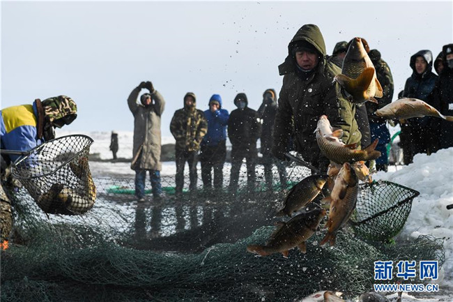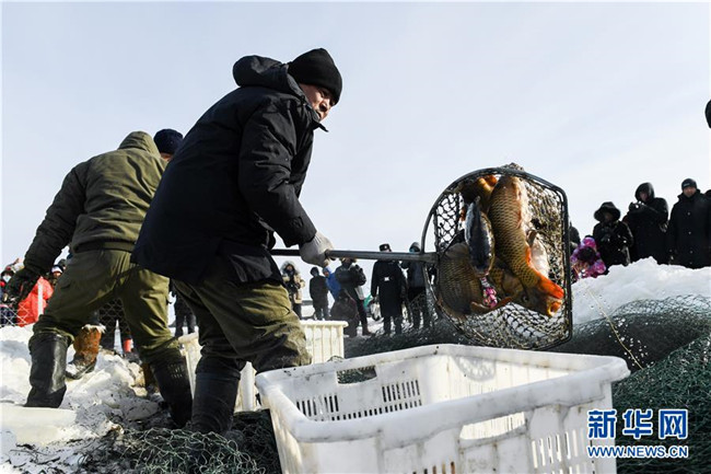 12月18日,工作人員將冬捕魚打撈上岸。 新華社記者 劉磊 攝