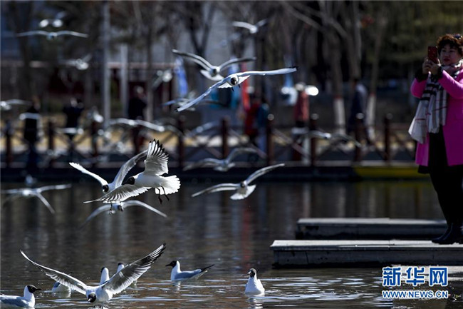 紅嘴鷗在寧夏銀川市燕鴿湖公園覓食(3月21日攝)。 新華社記者 馮開華 攝