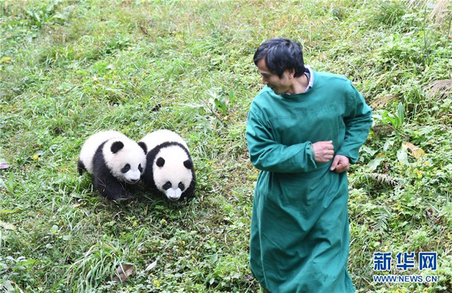 12月22日,飼養(yǎng)員引導(dǎo)大熊貓寶寶到戶外運動。當(dāng)日,重慶動物園為4只大熊貓寶寶“雙雙”“重重”“喜喜”“慶慶”舉行半歲生日慶?;顒?。4只半歲大熊貓在飼養(yǎng)員的照料下,在熊貓館運動場內(nèi)玩耍、嬉戲,與市民游客一同過冬至。新華社記者唐奕攝