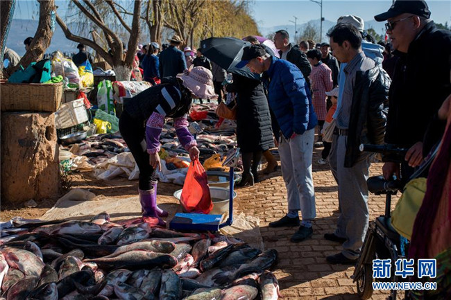 星云湖畔的老河咀魚(yú)市熱鬧非凡(12月25日無(wú)人機(jī)拍攝)。新華社記者 胡超 攝