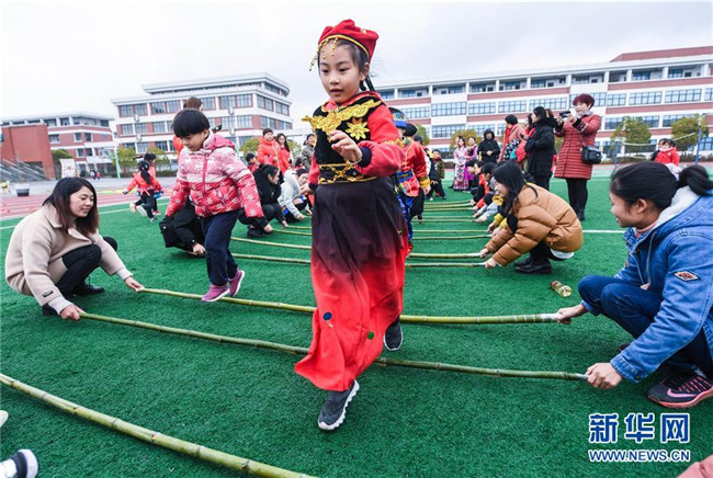 12月26日,身著少數(shù)民族服裝的孩子與同學(xué)們一起體驗(yàn)竹竿舞趣味活動(dòng)。當(dāng)日,浙江省長(zhǎng)興縣李家巷鎮(zhèn)中心幼兒園舉辦“炫彩民族風(fēng)歡樂(lè)來(lái)運(yùn)動(dòng)”為主題的趣味民族游戲活動(dòng)。該幼兒園有一些孩子來(lái)自壯族、苗族、布依族等少數(shù)民族。幼兒園旨在通過(guò)這種活動(dòng),讓孩子們和家長(zhǎng)共同體驗(yàn)竹竿舞、篝火舞、擲糠包等少數(shù)民族特色游戲,了解少數(shù)民族特色文化。新華社記者徐昱攝