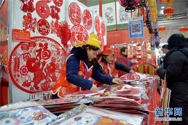 1月8日,商販在內(nèi)蒙古國際會(huì)展中心售賣窗花等年貨。新華社記者 王靖 攝