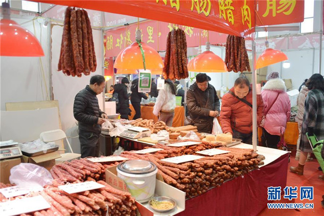 1月8日,消費(fèi)者在內(nèi)蒙古國際會(huì)展中心挑選香腸等年貨。新華社記者 王靖 攝
