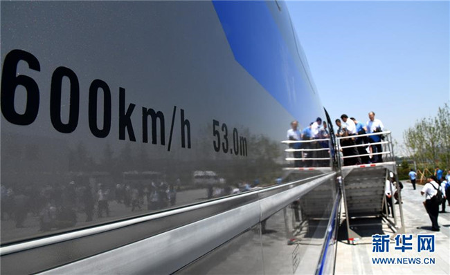 2019年5月23日,參觀人員在山東青島登上時(shí)速600公里高速磁浮試驗(yàn)樣車參觀。 新華社記者李紫恒攝