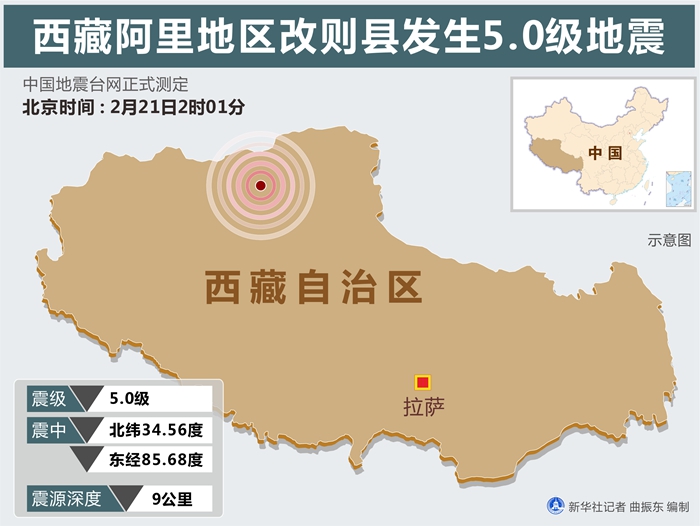 中國地震臺網(wǎng)正式測定:2月21日2時(shí)01分,在西藏阿里地區(qū)改則縣(北緯34.56度,東經(jīng)85.68度)發(fā)生5.0級地震,震源深度9公里。