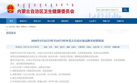 截至2月24日7時,內(nèi)蒙古自治區(qū)累計報告新冠肺炎確診病例75例, 現(xiàn)存確診病例45例,出院病例30例,重癥病例3例,危重病例4例。
