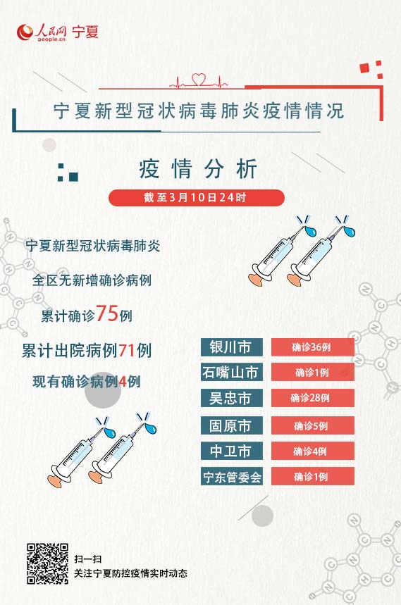 截至3月10日24時,全區(qū)現(xiàn)有確診病例4例,累計出院病例71例。全區(qū)累計報告確診病例75例,其中銀川市36例,石嘴山市1例,吳忠市28例,固原市5例,中衛(wèi)市4例,寧東1例。全區(qū)無疑似病例。