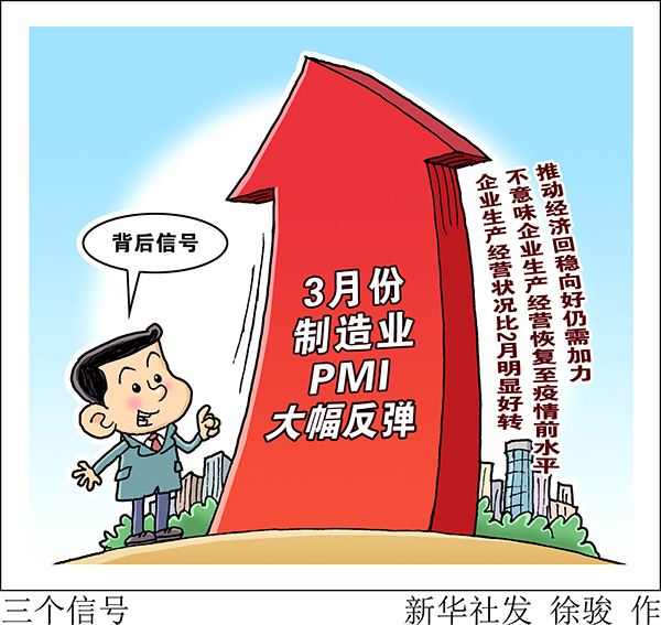 國家統(tǒng)計局服務業(yè)調查中心、中國物流與采購聯(lián)合會31日發(fā)布數(shù)據,3月份,中國制造業(yè)采購經理指數(shù)(PMI)為52%,比上月回升16.3個百分點。制造業(yè)PMI為何大幅反彈?回到榮枯線上方是否意味著經濟企穩(wěn)?記者采訪了相關部門和專家。