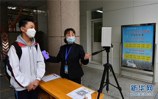 4月7日,西安匯知中學(xué)初三學(xué)生進(jìn)入校園時(shí)測(cè)量體溫。