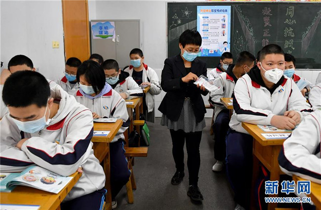 4月7日,西安匯知中學(xué)初三畢業(yè)班的老師向?qū)W生發(fā)放口罩。