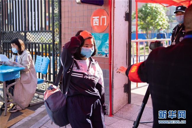 4月13日,在長沙寧鄉(xiāng)市長郡溈東中學(xué),學(xué)生進(jìn)入學(xué)校時接受體溫測量。新華社發(fā)(陳思汗 攝)