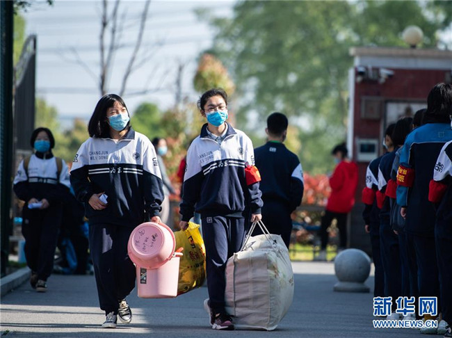 4月13日,在長沙寧鄉(xiāng)市長郡溈東中學(xué),住校學(xué)生搬運行李。新華社發(fā)(陳思汗 攝)