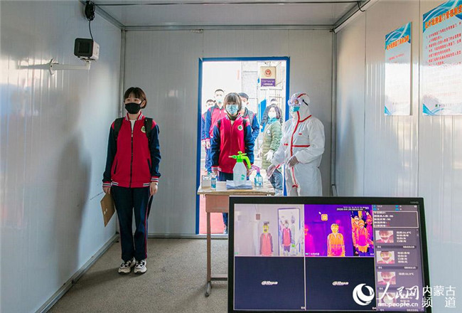 內(nèi)蒙古呼和浩特市第十二中學(xué)返校學(xué)生在測(cè)量體溫。