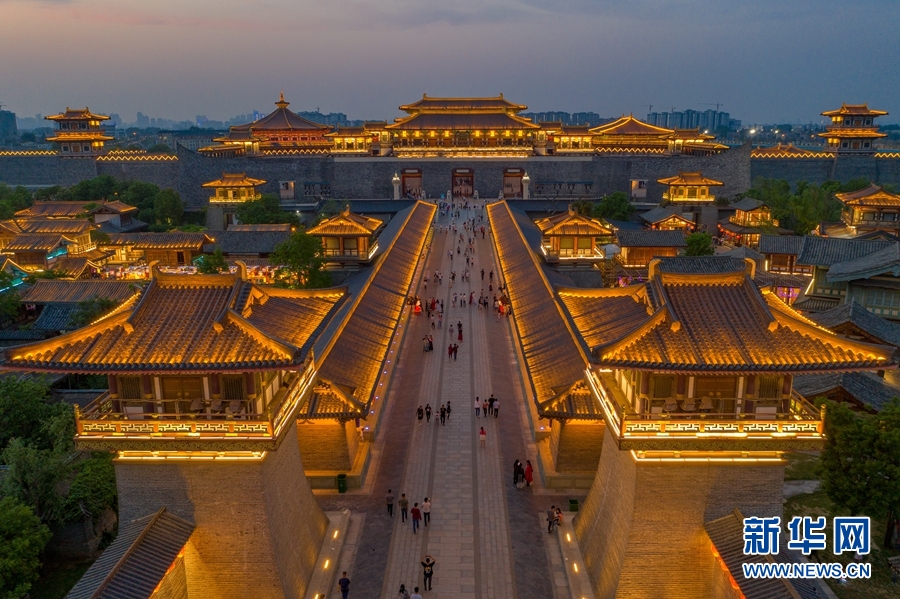 5月1日,游客在湖北省襄陽市唐城景區(qū)觀賞夜景(無人機照片)。 新華社發(fā)(楊東 攝)