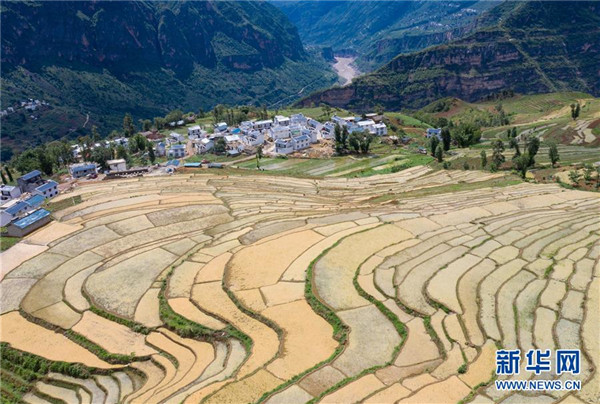 6月24日,金沙江邊的四川省布拖縣拉果鄉(xiāng)偉木村安全住房依山而建錯落有致(無人機(jī)照片)。新華社記者江宏景攝