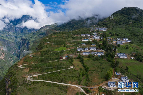 6月24日,懸崖邊的四川省布拖縣拉果鄉(xiāng)布歪村安全住房依山而建錯落有致(無人機(jī)照片)。新華社記者江宏景攝