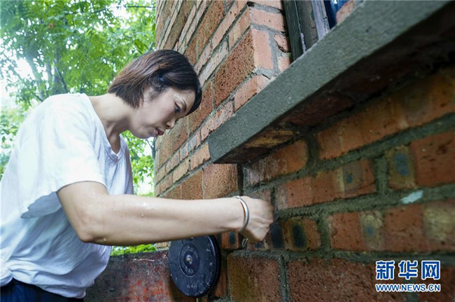 7月1日,地質(zhì)災(zāi)害監(jiān)測(cè)員侯芳對(duì)一處農(nóng)房的墻上裂縫寬度進(jìn)行測(cè)量。 新華社記者 劉潺 攝