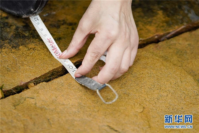 7月1日,地質(zhì)災(zāi)害監(jiān)測(cè)員侯芳在古家坳不穩(wěn)定斜坡地質(zhì)災(zāi)害點(diǎn)的一條裂縫前進(jìn)行測(cè)量工作。新華社記者 劉潺 攝