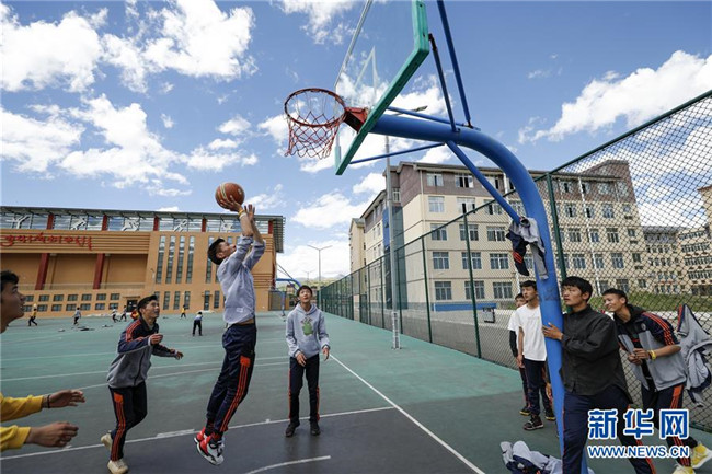 在四川省阿壩藏族羌族自治州阿壩縣藏文中學(xué)新的籃球場(chǎng)上,初中二年級(jí)男生在體育課上打籃球(6月14日攝),周圍則是新的教學(xué)樓和體育運(yùn)動(dòng)場(chǎng)館。新華社記者 沈伯韓 攝