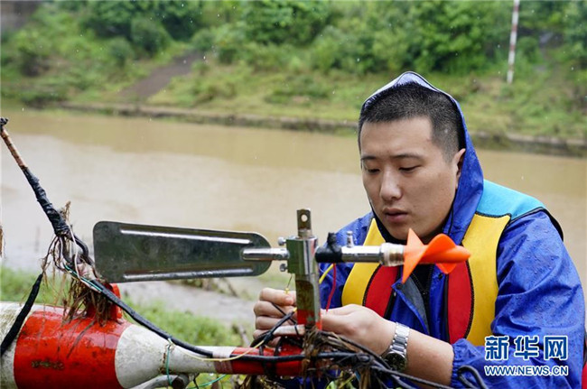 7月1日,在永川區(qū)臨江河來(lái)蘇水文站,站長(zhǎng)鐘睿在安裝調(diào)試流速儀。新華社記者 劉潺 攝