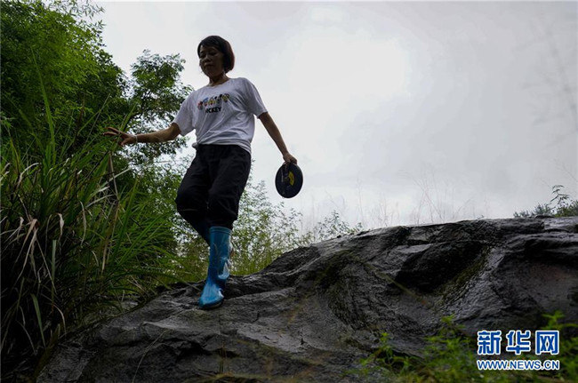 7月1日,在重慶永川區(qū),地災(zāi)監(jiān)測(cè)員侯芳走在崎嶇的山道上,進(jìn)行巡查監(jiān)測(cè)工作。新華社記者 劉潺 攝