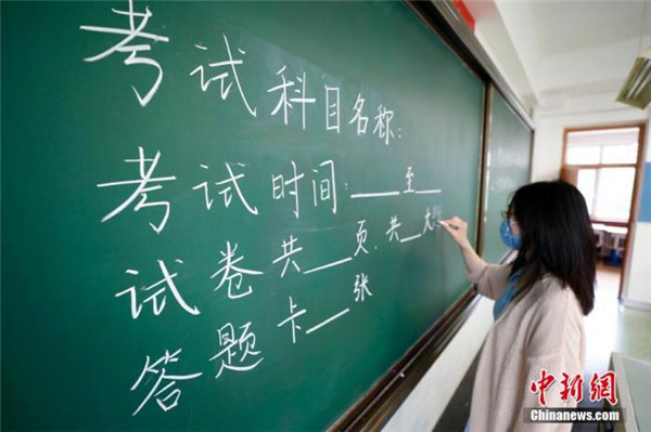圖為北京十二中老師布置標(biāo)準(zhǔn)考場。 中新社記者 富田 攝