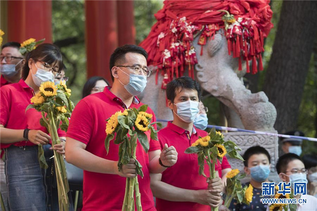 7月8日,在黑龍江省哈爾濱市第三中學(xué)考點(diǎn)外,老師拿著向日葵迎接考生。 當(dāng)日,全國(guó)部分地區(qū)2020年高考結(jié)束。 新華社發(fā)(張濤攝)