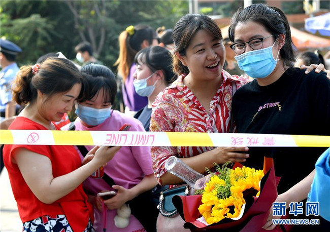 7月8日,一名考生(右)在湖南省長(zhǎng)沙市一中考點(diǎn)外從家長(zhǎng)手中接過(guò)鮮花。 當(dāng)日,全國(guó)部分地區(qū)2020年高考結(jié)束。 新華社記者 薛宇舸 攝