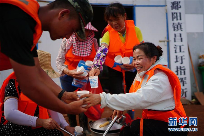 7月11日,在江西省鄱陽縣鄱陽鎮(zhèn)江家?guī)X村,“阿姨團(tuán)”隊長余風(fēng)英(右一)給武警戰(zhàn)士盛綠豆湯。 新華社記者 周密 攝
