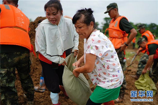 村民余風(fēng)英是這支“阿姨團(tuán)”的隊長,“我們之前都是一起跳廣場舞的‘舞友’,洪水來了,看到這么多救援人員來幫我們修圩堤,我們也要盡一份自己的力量。”