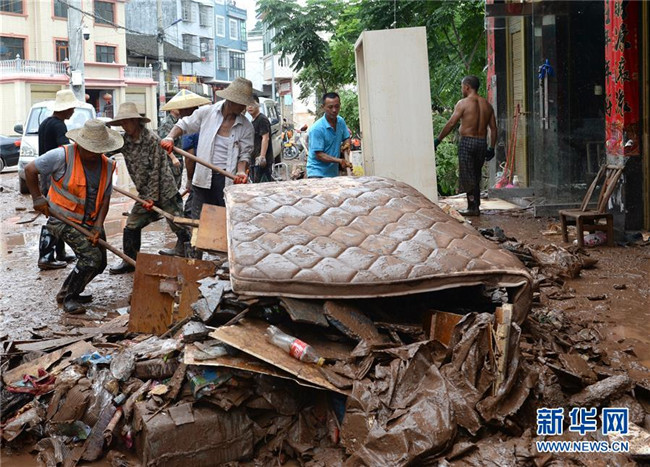 7月9日,在湖南湘西土家族苗族自治州瀘溪縣白羊溪鄉(xiāng),村民清理受損物品。 新華社發(fā)(陳振海攝)