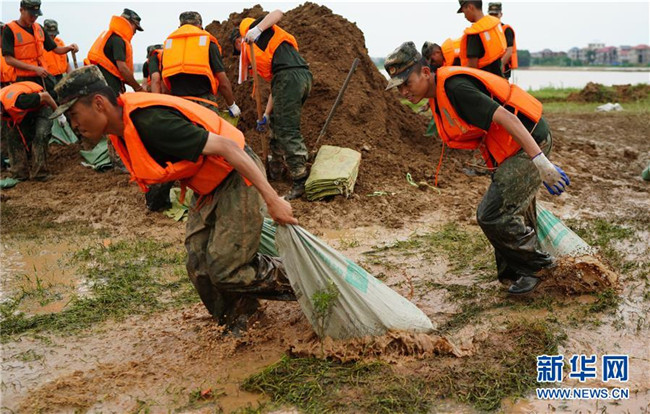 7月11日,武警戰(zhàn)士在江西省鄱陽縣鄱陽鎮(zhèn)江家?guī)X村搬運(yùn)沙袋。 新華社記者 周密 攝