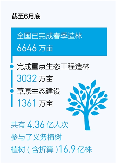 記者從國家林業(yè)和草原局獲悉:今年上半年,全國綠化委員會、國家林業(yè)和草原局科學(xué)指導(dǎo)各地各部門在做好疫情防控的同時積極有序開展春季造林綠化。截至6月底,全國已完成春季造林6646萬畝,占全年造林任務(wù)的65.8%;完成重點(diǎn)生態(tài)工程造林3032萬畝、草原生態(tài)建設(shè)1361萬畝。共有4.36億人次參與了義務(wù)植樹,植樹(含折算)16.9億株。