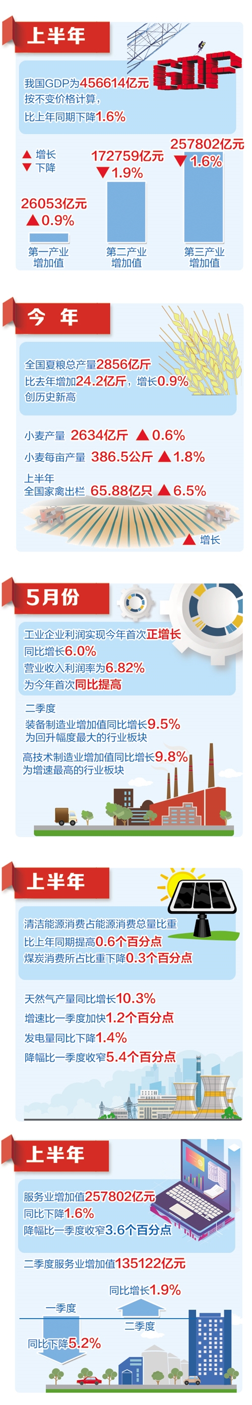 上半年,我國GDP為456614億元,按不變價(jià)格計(jì)算,比上年同期下降1.6%。其中,第一產(chǎn)業(yè)增加值26053億元,增長(zhǎng)0.9%;第二產(chǎn)業(yè)增加值172759億元,下降1.9%;第三產(chǎn)業(yè)增加值257802億元,下降1.6%。