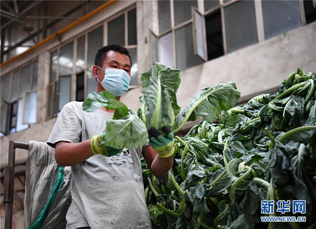 7月18日,在烏魯木齊市沙依巴克區(qū)新疆九鼎農(nóng)產(chǎn)品批發(fā)市場(chǎng),一商戶整理蔬菜。 新華社記者 宋彥樺 攝