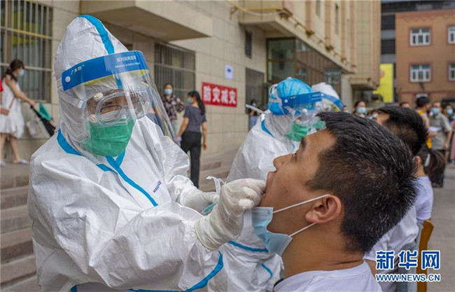 7月17日起,烏魯木齊市開始對(duì)全市居民進(jìn)行免費(fèi)核酸檢測(cè),重點(diǎn)人群所在社區(qū)要實(shí)現(xiàn)100%檢測(cè)。家住天山區(qū)光北社區(qū)的63歲居民雷雙蘭說(shuō):“19日社區(qū)挨戶通知下樓排隊(duì)檢測(cè),大家都戴著口罩,前后保持一米安全距離,一家人幾分鐘就檢測(cè)完了。”