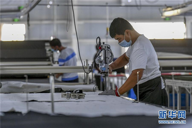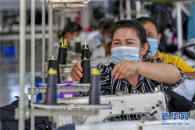 7月19日,在新疆喀什地區(qū)巴楚縣紡織服裝產(chǎn)業(yè)園一服裝企業(yè)車間,員工在生產(chǎn)線上忙碌。 新華社記者 馬鍇 攝