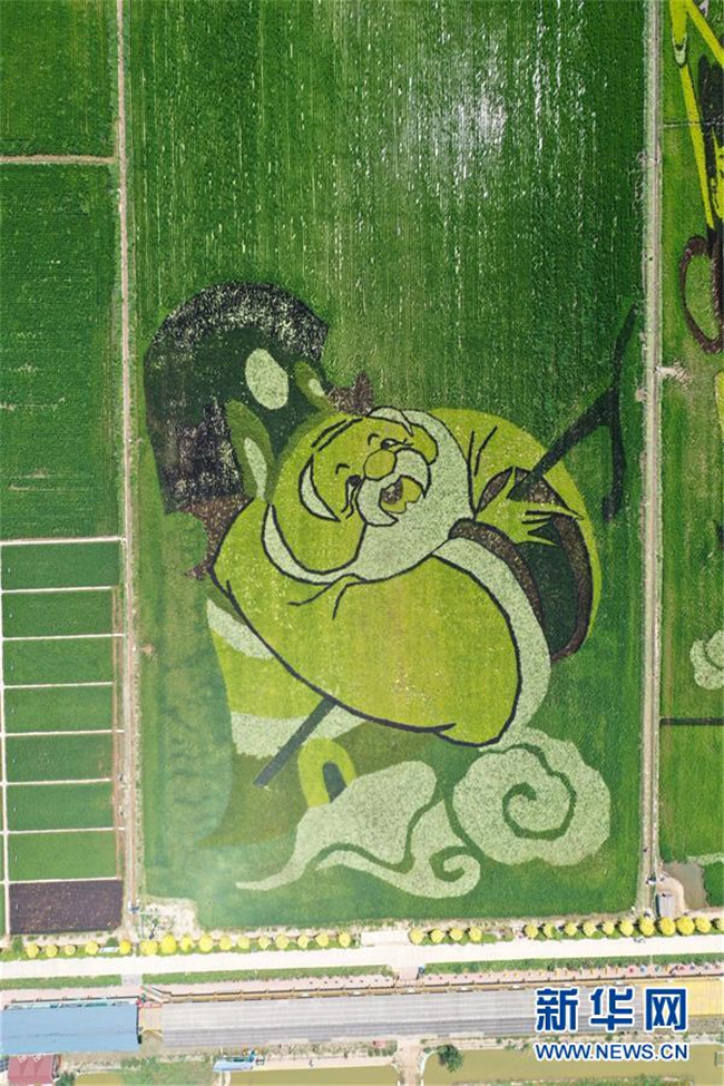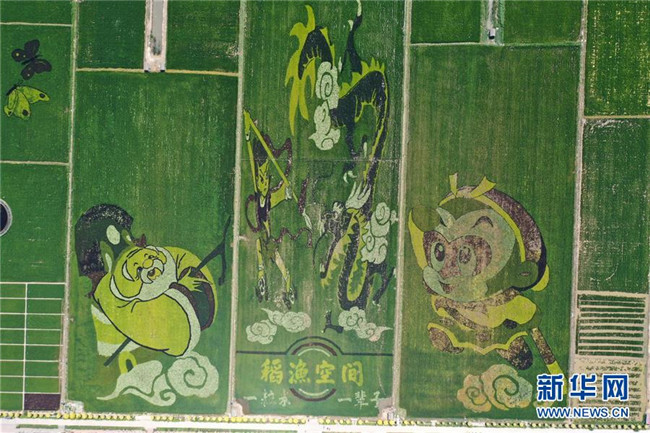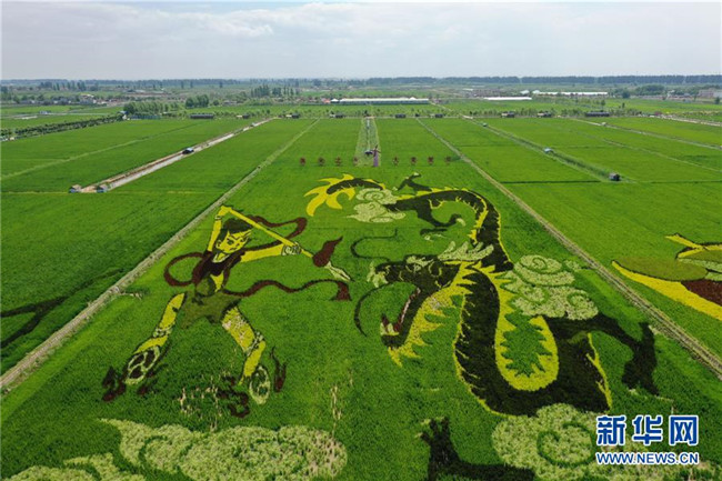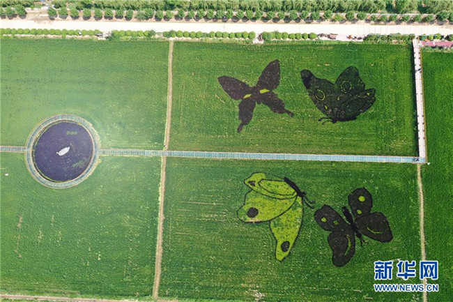 這是寧夏賀蘭縣稻漁空間鄉(xiāng)村生態(tài)觀光園內(nèi)的稻田畫(huà)(7月22日攝,無(wú)人機(jī)照片)。新華社記者 劉海 攝