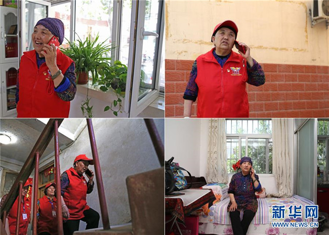 這是一張拼版照片。左上圖為:王蘭花在蘭花志愿服務(wù)站組織活動間隙接聽電話(6月23日攝);左下圖為:王蘭花在探望裕西社區(qū)老黨員的途中接聽電話(6月23日攝);右上圖為:王蘭花在裕西社區(qū)巡邏間隙接聽電話(6月23日攝);右下圖為:王蘭花下班回到家后接聽電話(6月23日攝)。由于平日經(jīng)常收到群眾求助,接聽電話成為王蘭花工作和生活中的常態(tài)。新華社記者 賈浩成 攝