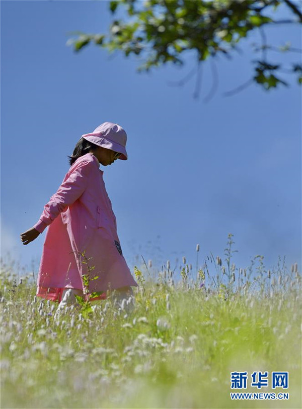 一名游客在魯朗旅游小鎮(zhèn)的高山牧場游玩(7月26日攝)。新華社記者張汝鋒攝