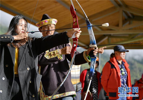 一名游客在當?shù)剞r(nóng)牧民的指導下射擊響箭(7月26日攝)。新華社記者張汝鋒攝